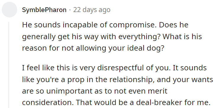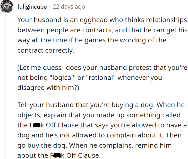 And it wasn’t just the dog; OP’s husband seemed to be obsessed with calling the shots in their marriage.