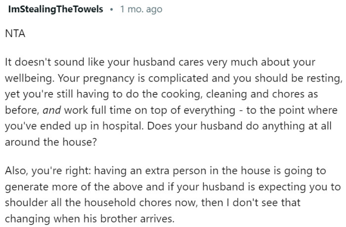 It is crucial for her husband to understand that while supporting his brother is admirable, he must not ignore the needs and health of his pregnant wife. Therefore, a reconsideration of the arrangement or at least a thorough conversation between the couple to address OP's concerns is of paramount importance.