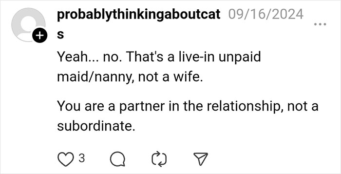 Even the Trad Wives subreddit, a community that often advocates traditional gender roles, responded with skepticism, noting that a healthy marriage is built on mutual respect and partnership, not control or dominance.