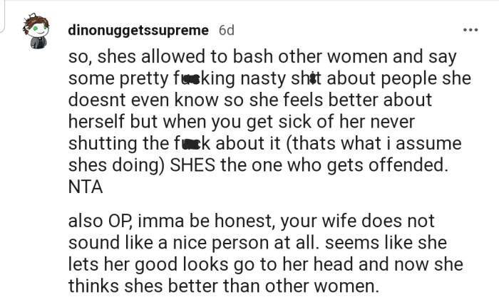 OP explained that he loves his wife dearly, and their future together holds endless possibilities. However, her habit of tearing down other women's looks has started to take a toll on him.