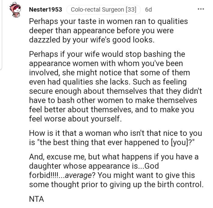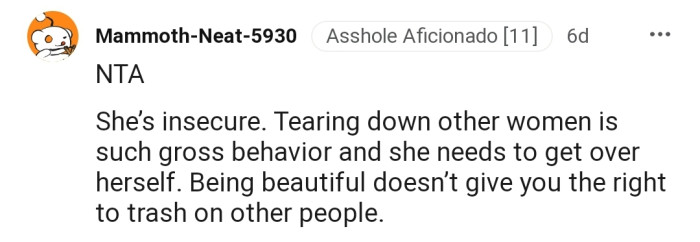 The Reddit community's verdict was clear: OP's wife's continuous belittlement of other women was seen as unfair and unwarranted. While beauty is subjective, tearing down others based on their looks is never acceptable.