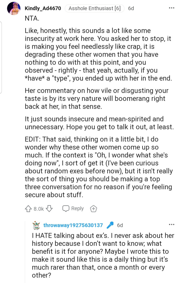 Eventually, OP confronted his wife, explaining how her relentless bashing made him feel insulted and bad about his supposedly "disgusting" dating history. While OP admitted that some of her judgments held a bit of truth, he insisted that most of his exes were undeniably beautiful.