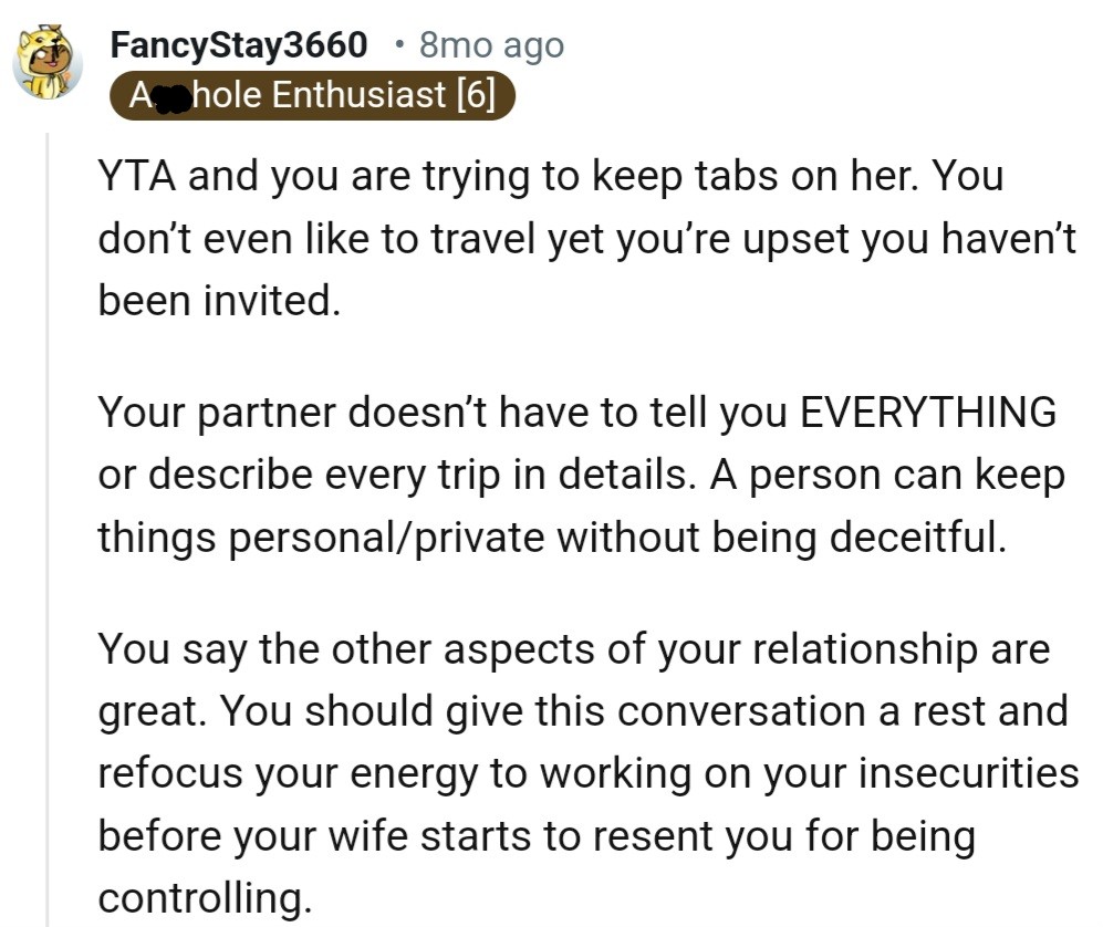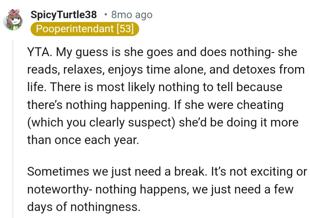 Redditors seem to think OP might be overthinking it. They suggest that his wife’s yearly trip is likely just a much-needed escape to relax and recharge, not some secret affair.