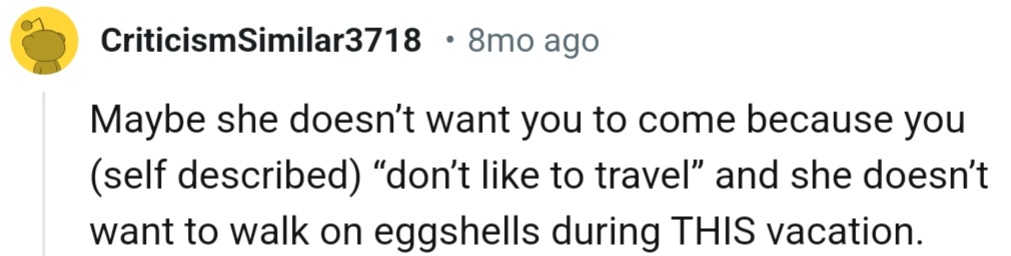 "Maybe she doesn't want you to come because you (self-described) "don't like to travel"