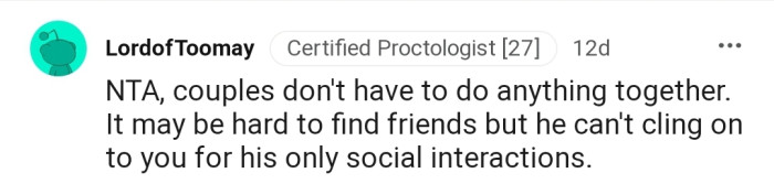 This situation highlights the common challenges couples face in balancing individual desires with shared experiences. It's important for partners to communicate openly about their feelings and expectations to ensure both individuals feel valued in the relationship.