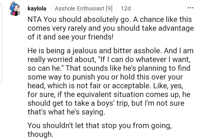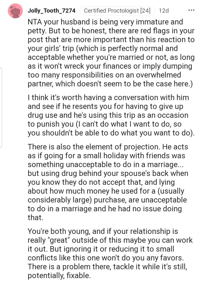 Reddit.comOP was excited about the chance to reconnect with her friends on a girl's trip, but her husband wasn't pleased about being without her for a week