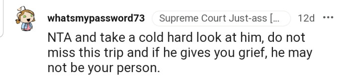 "NTA and take a cold hard look at him; do not miss this trip, and if he gives you grief."