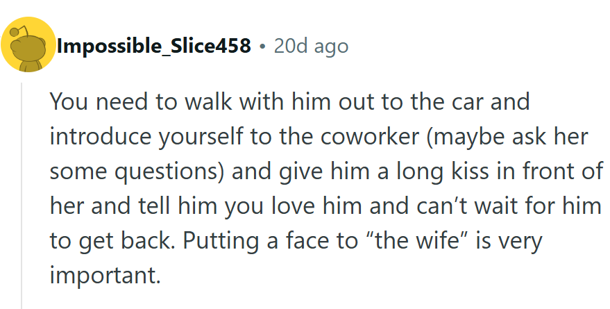 Her husband did offer to buy her a ticket when they first made the plans, but the cost was high, and finding childcare was nearly impossible. Now, she feels stuck at home while he goes out with someone she can’t help but view as competition.