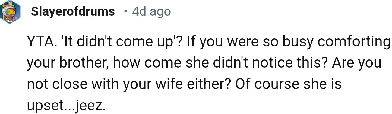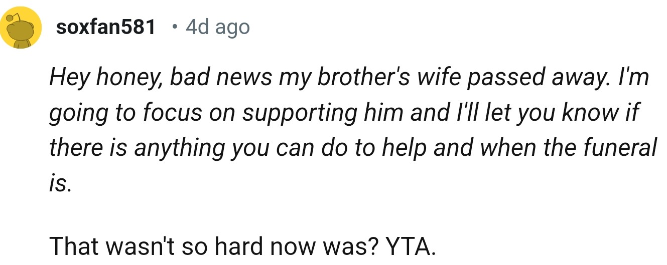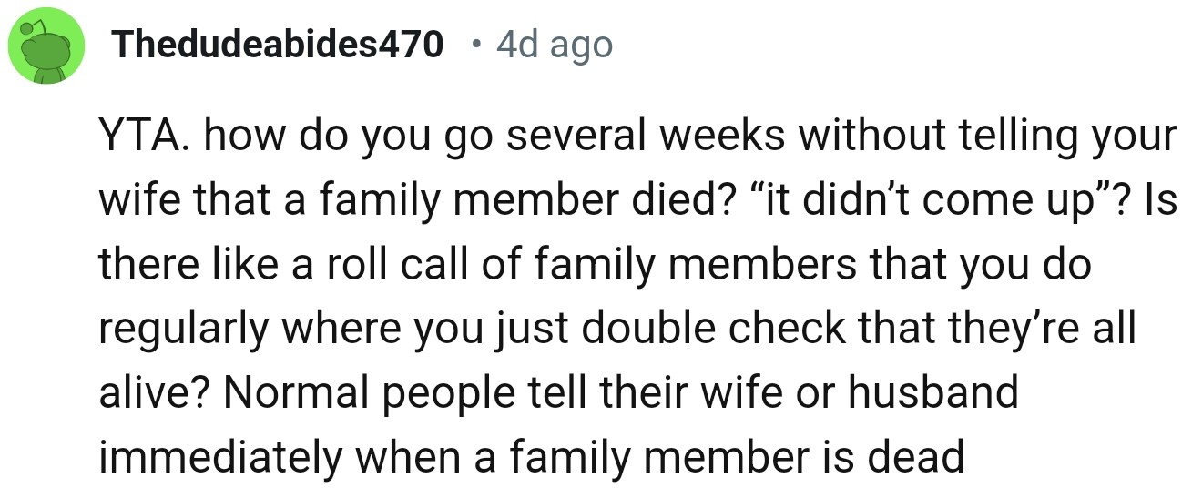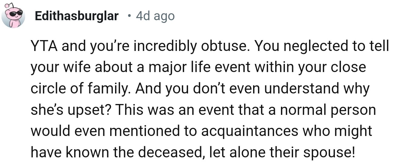 Redditors, never shy with their opinions, weighed in heavily on this one. The verdict echoed AH very loudly. Communication is key in any marriage, and they couldn’t even fathom how any good husband would keep his wife in the dark about a death in the family.