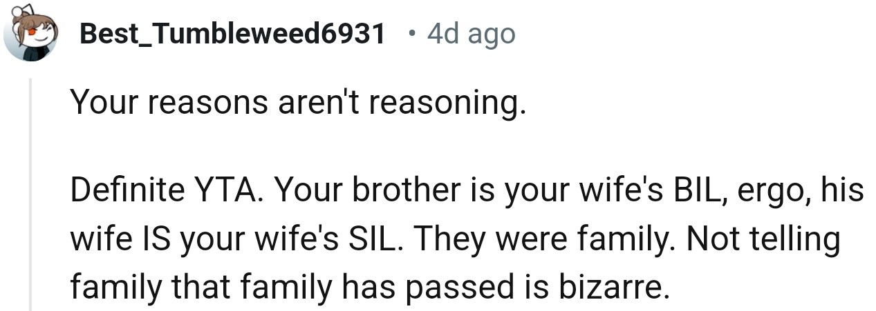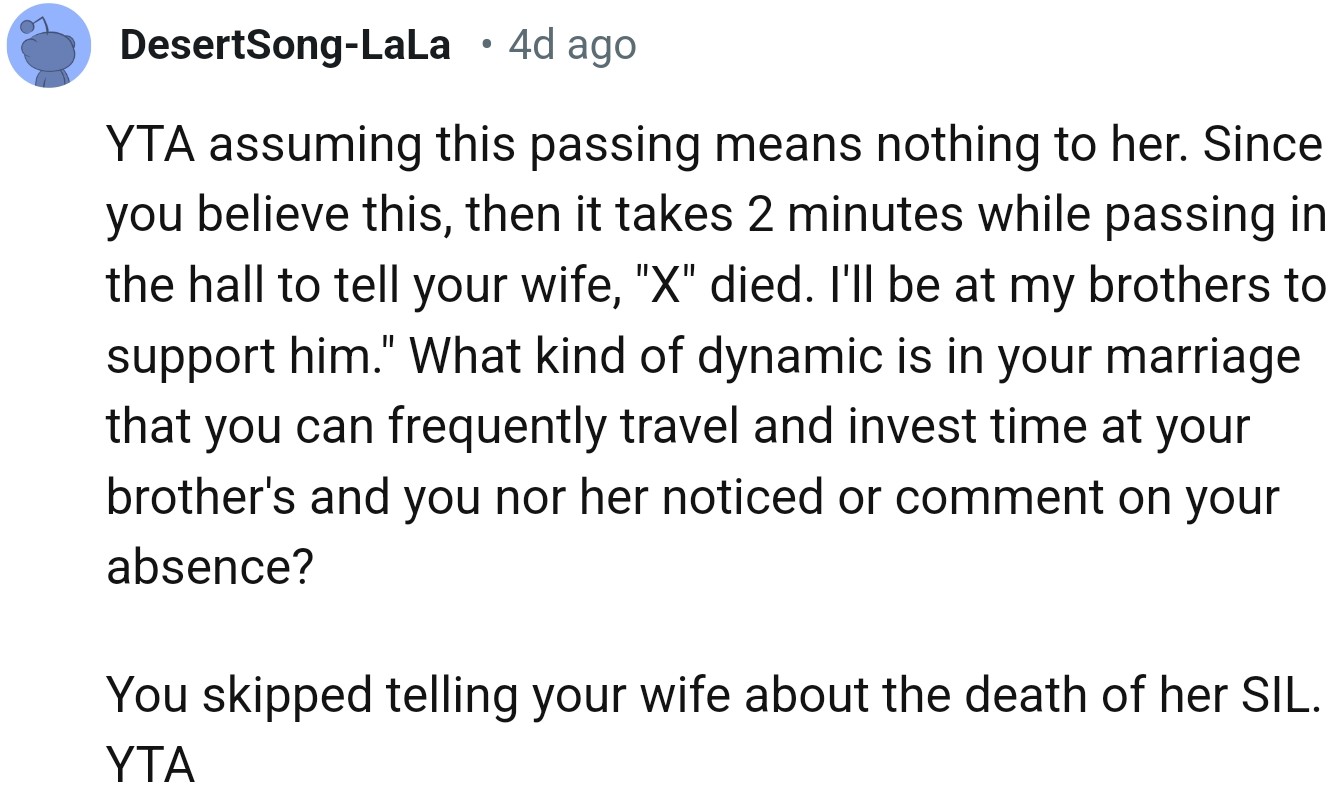 His wife couldn’t understand how he could keep such information from her for so long. In OP’s defense, since they weren't particularly close to his sister-in-law, he didn't think his wife would be too affected by the news.