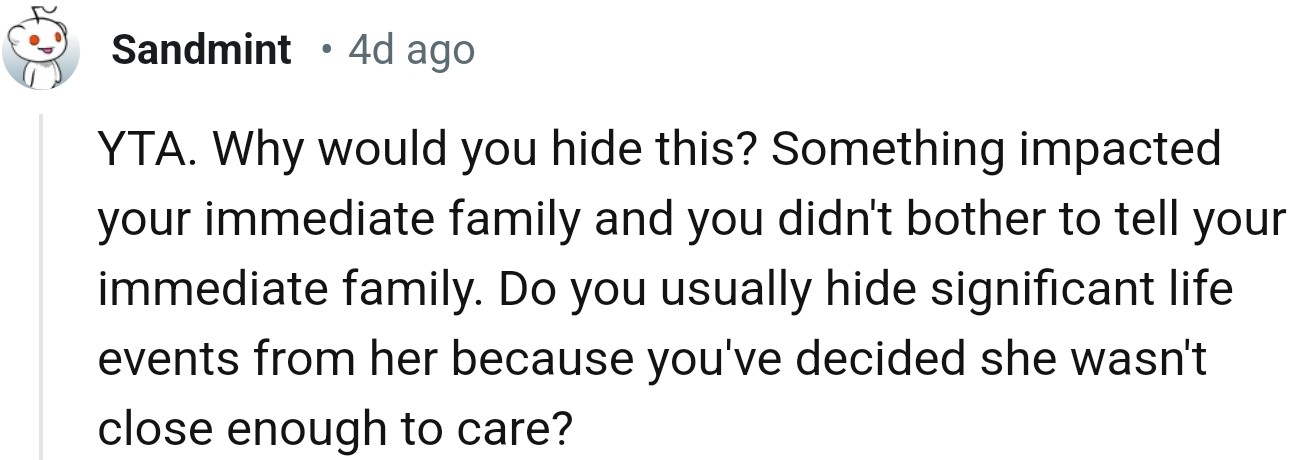 "Do you usually hide significant life events from her because you decided she wasn't close enough to care?"