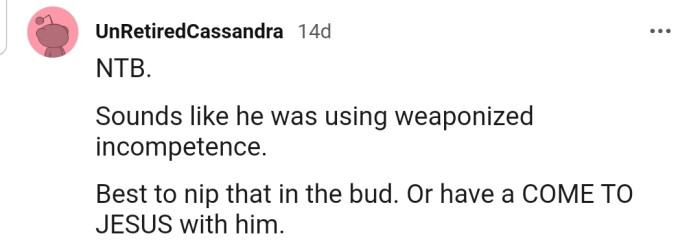 This scenario highlights the complexities of household dynamics, where weaponized incompetence can create tension. The husband's behavior may reflect deeper issues related to accountability and power within the relationship, warranting open discussions about task distribution.