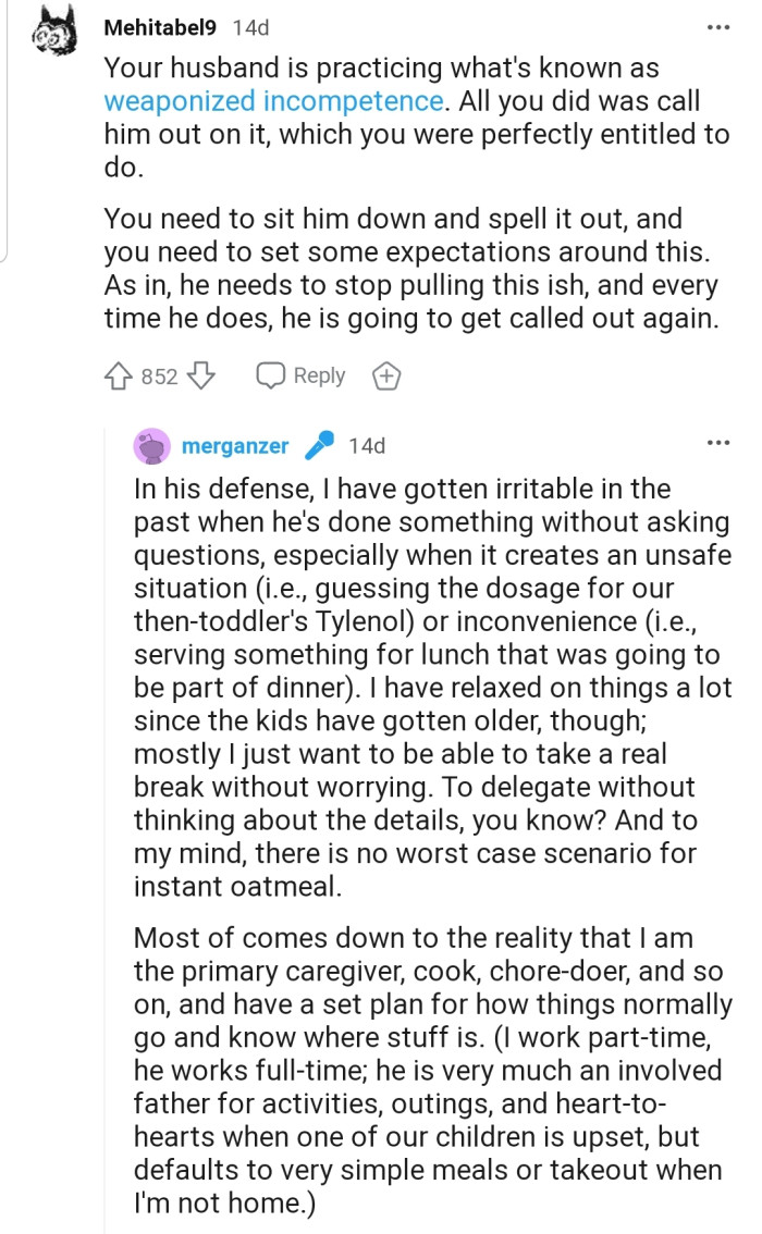 "Your husband is practicing what's known as weaponized incompetence. All you did was call him out on it, which you were perfectly entitled to do."