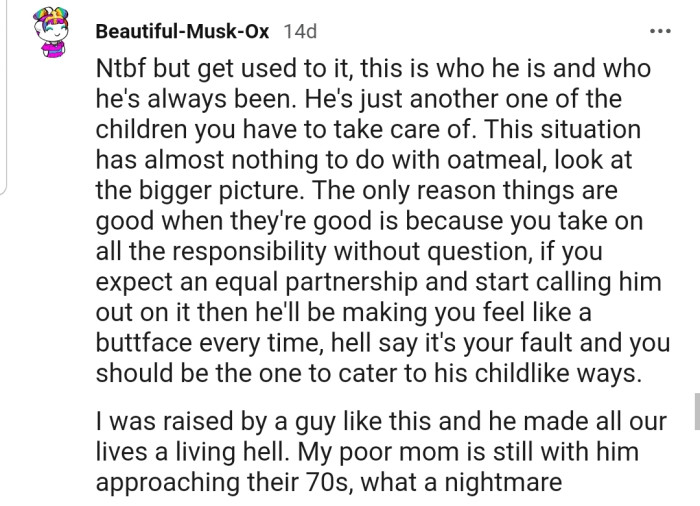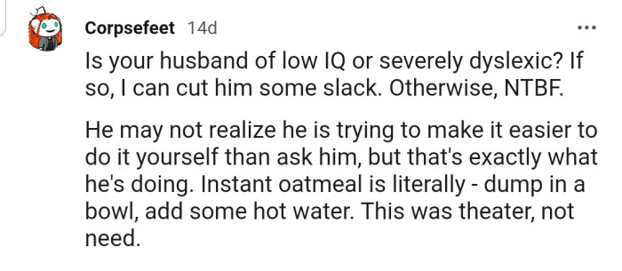 While it's easy to laugh at the husband's inability to make instant oatmeal, the wife's frustration brings a deeper conversation to the table: one of shared responsibilities and expectations.