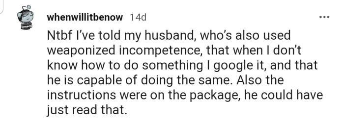 "I’ve told my husband, who’s also used weaponized incompetence, that when I don’t know how to do something, I Google it."
