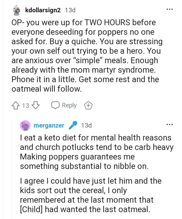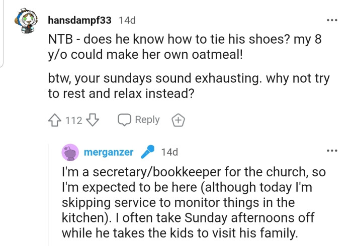 Reddit.comSundays are a bit of an avalanche for OP and their family. On this particular Sunday, they split some duties with their husband to speed up the work and leave the house on time.