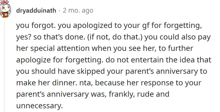Relationships involve compromise and understanding, and both partners should be empathetic and supportive of each other's needs. Thus, Redditors agreed that the OP was not in the wrong for attending his parents' anniversary.