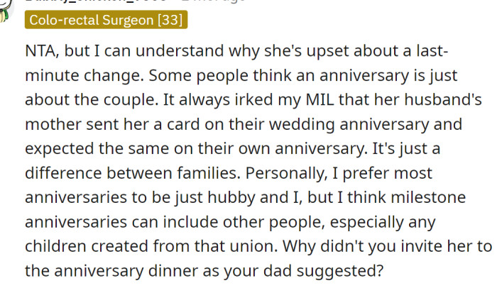 "She responded very dismissively and questioned why I would want to celebrate an anniversary with my parents."