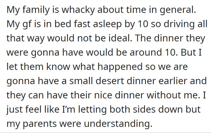 "I just feel like I’m letting both sides down, but my parents were understanding," explained the OP.