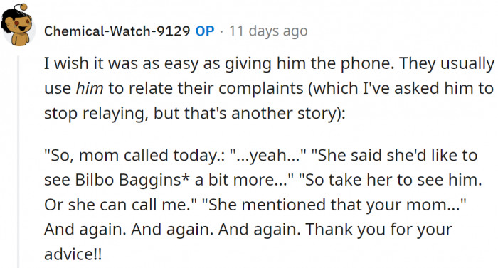 "So they complain when they babysit if she's there too long... but also complain they don't see her enough?"