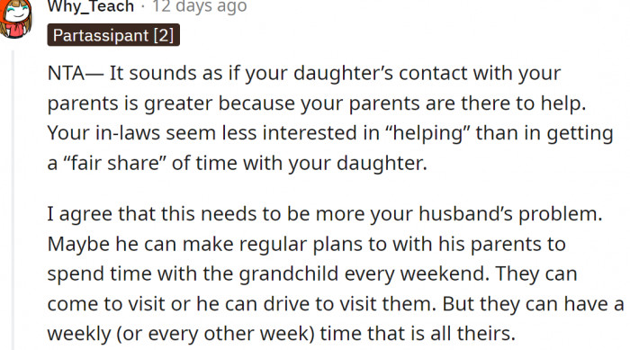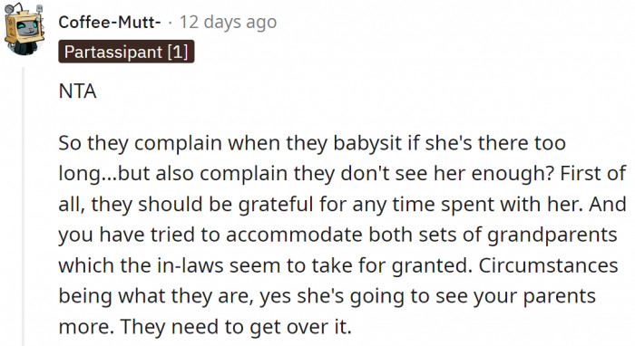 redditThe OP's in-laws have always complained that their granddaughter sees OP's parents more than them: