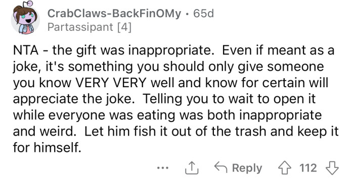 Birthdays are special and fun, and so are gag gifts; but what happens when a gag gift is just plain inappropriate and gross? Reddit user u/Unable_Secretary8953 shared her experience with a rather problematic birthday gift in the AITA (Am I The A**hole?) subreddit.