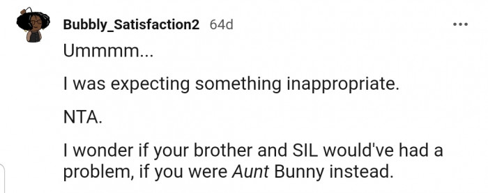 "I wonder if your brother and SIL would have had a problem if you were Aunt Bunny instead."