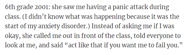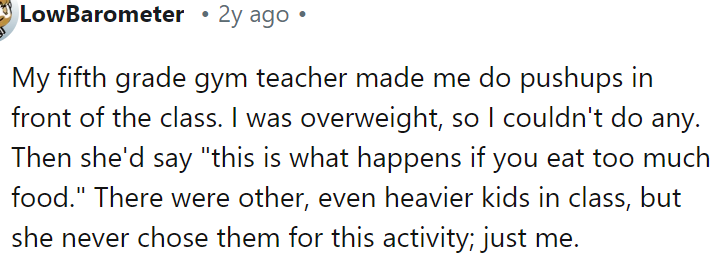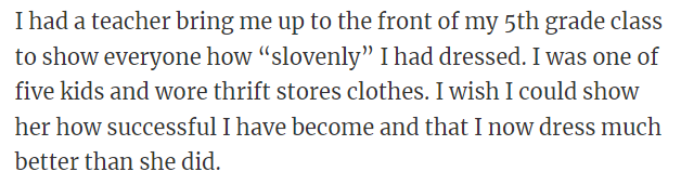 "I had a teacher bring me up to the front of my 5th-grade class to show everyone how 'slovenly' I had dressed."