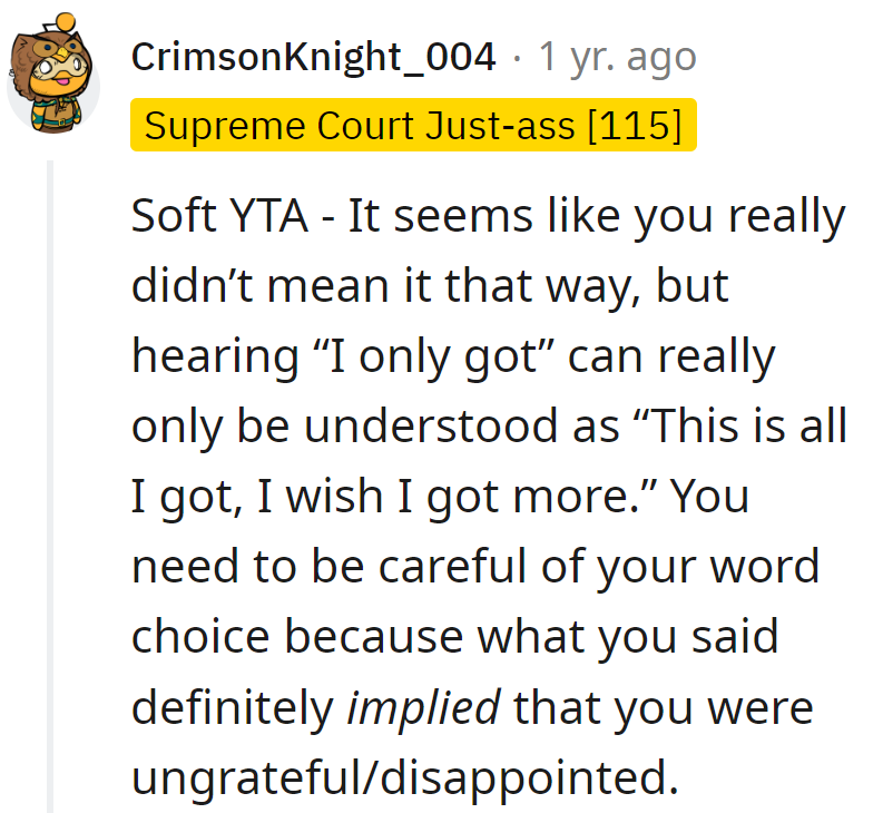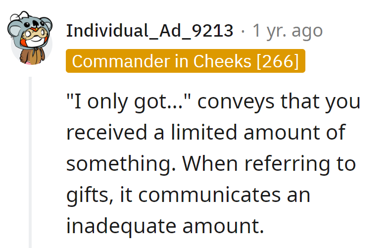 Reddit users have critiqued OP for her choice of words, particularly the use of 'only,' which suggested ingratitude. This incident serves as a reminder that the way we talk about our gifts can significantly impact how our appreciation is perceived.