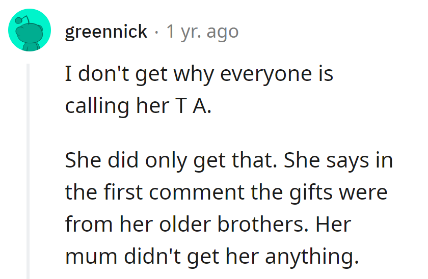This suggests that OP's comment might not stem from ingratitude, but rather a lack of understanding about emotional expression. Open family discussions about feelings and expectations surrounding gift-giving can help bridge this gap, fostering a more empathetic space for communication.