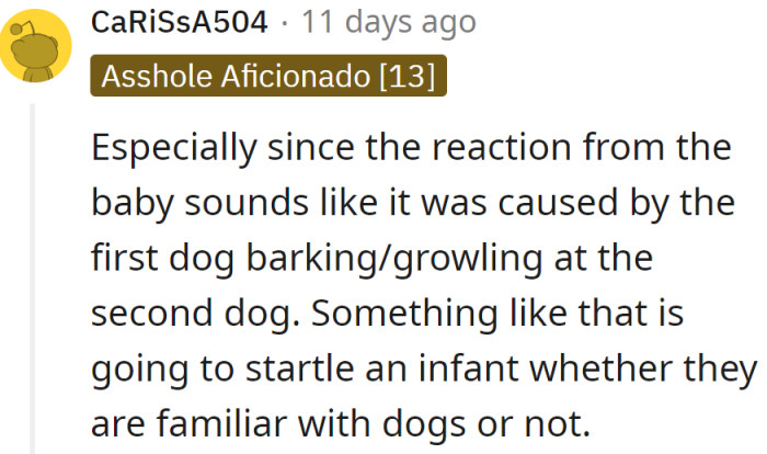"Especially since the reaction from the baby sounds like it was caused by the first dog barking", said another Redditor