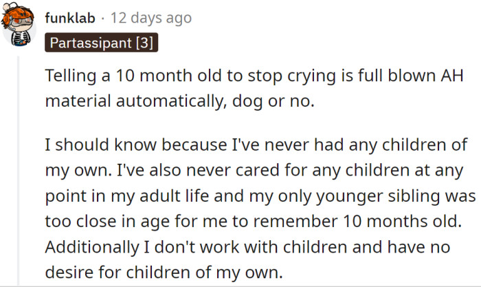 "Telling a 10 month old to stop crying is full blown AH material automatically, dog or no."