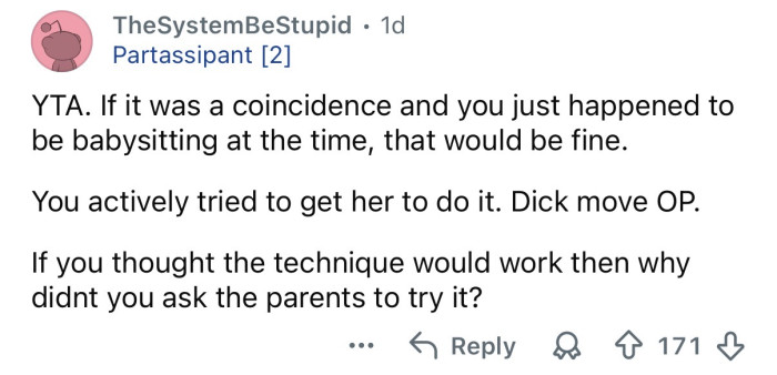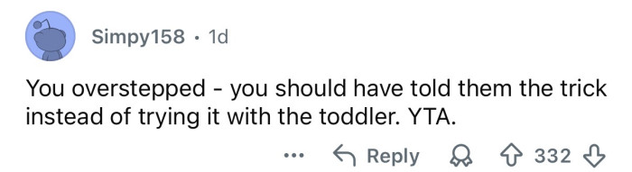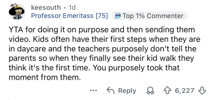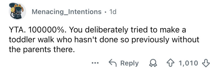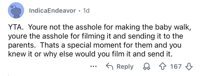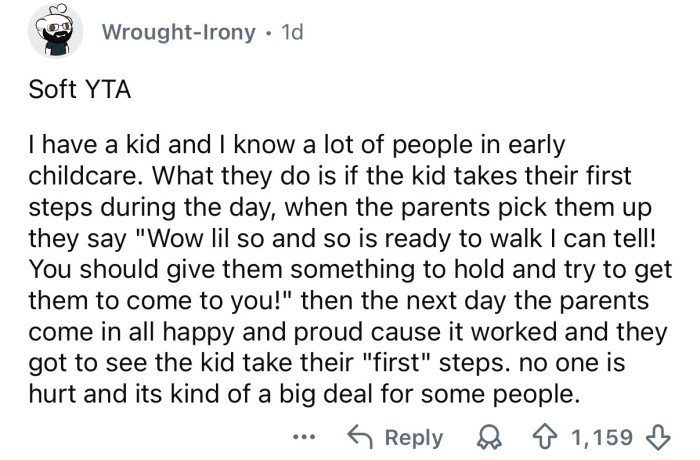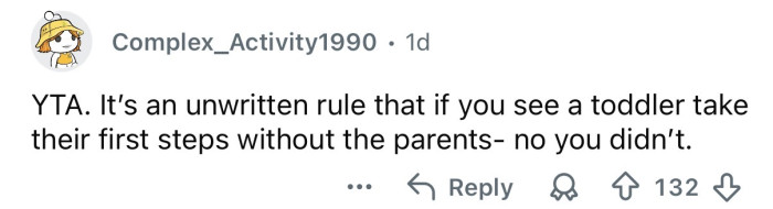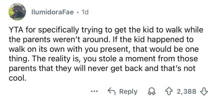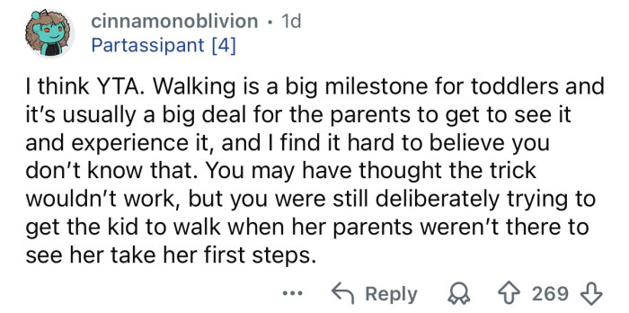 So I'm friends with this guy that I've known since kindergarten. He got married some years ago and now him and his wife have a little baby girl and she's currently at toddler age. I come over often enough that I'm used to seeing the little bugger and she's great. I don't have any other little kids from family or anything in my life so it's been great seeing a little human grow. Every once in a blue moon they ask me to watch her for a few hours while my friend and his wife get some date time or whatever they need to do. So I was hanging out with her and I know that they've been trying to get her to take her first steps. I read about a trick where if you make them hold something then they will walk without holding onto a surface. So I gave her a toy and filmed it and it worked! I sent the video to them and my friend didn't care, he was just happy but his wife was pissed! She was mad at me that they weren't there for that big moment. I don't have the type of relationship with her where I can have a deep 1 on 1 with her but I talked to my friend about it and he's not upset with me but his wife still is. She thinks I robbed her if a key moment.I did get it on film but I get what she's saying. I had no malicious intent but was I the AH for getting the toddler to take those first steps? I honestly didn't think the trick would work but it did.Here's how the Reddit community reacted.