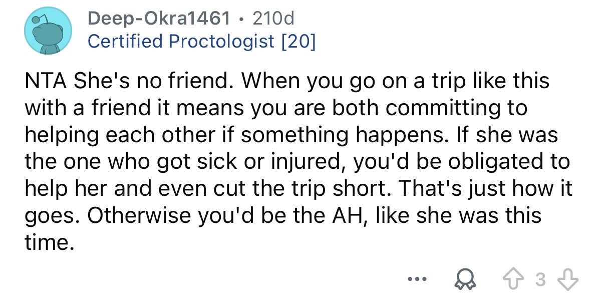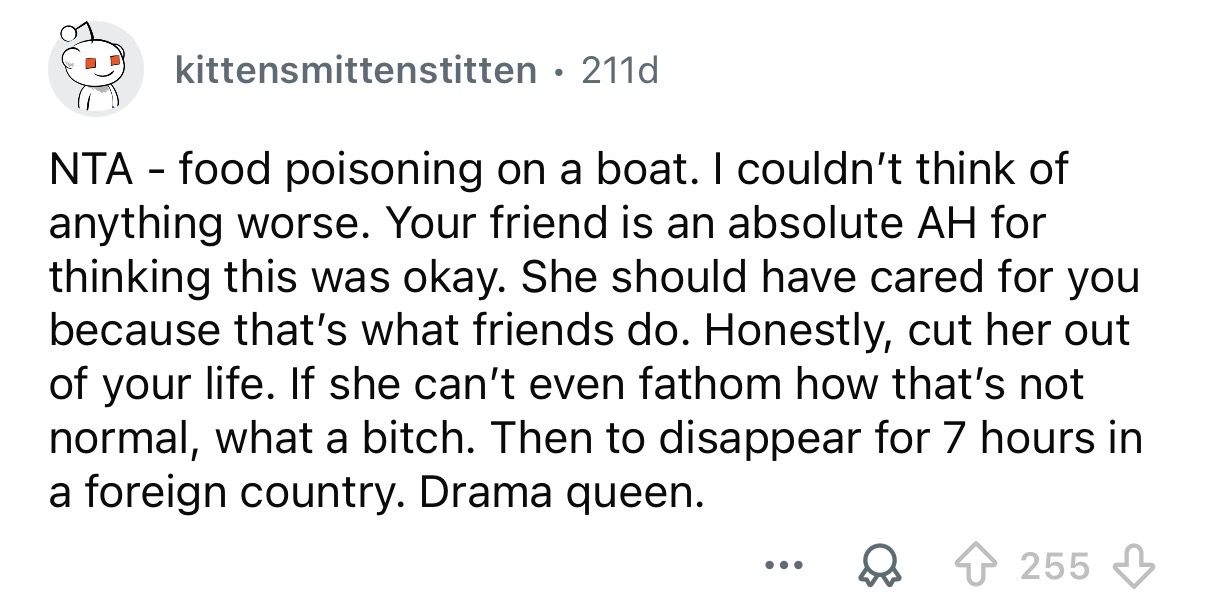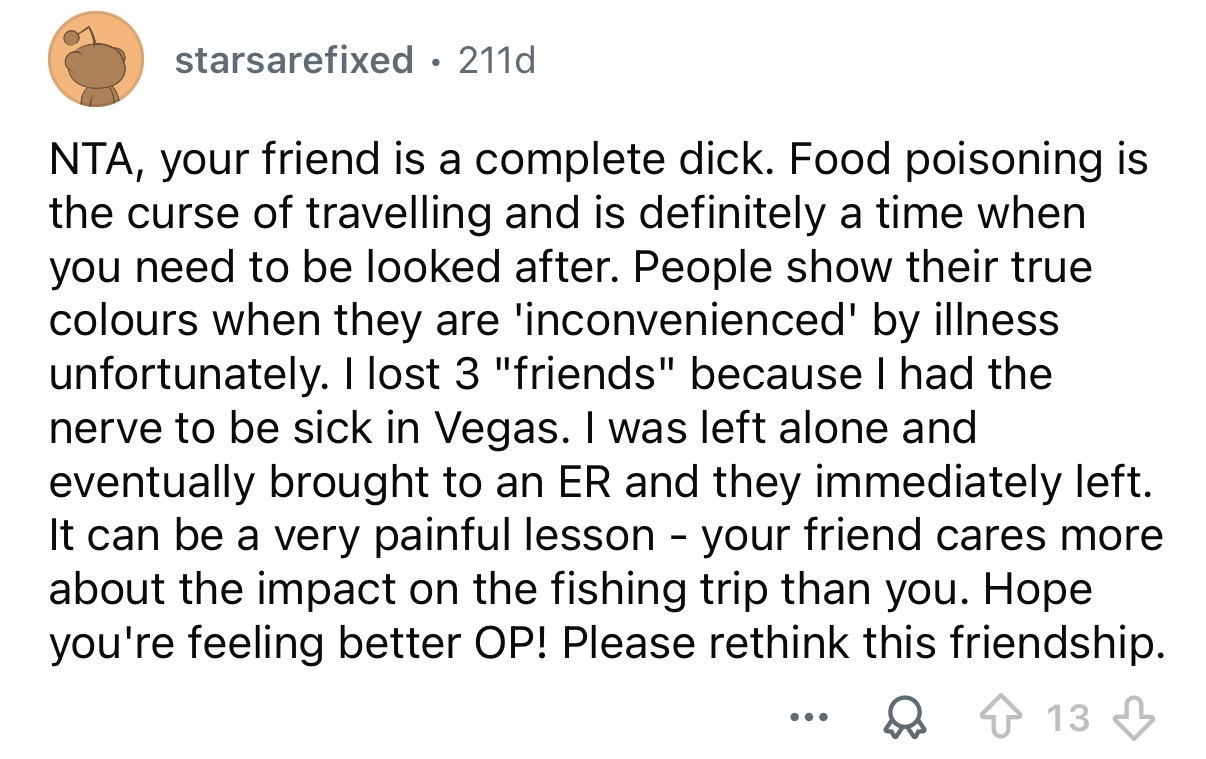 I (21F) and my friend (23F) went on a month long trip together to Thailand. We booked a fishing trip on one of the islands which we were both very excited about. We ordered breakfast while we were fishing and about an hour or more later I started to feel really sick (upset stomach, nausea, faint, and shaky). I mentioned to my friend that I wasn’t feeling well, and she told me to take a gravol. I took the gravol, but not long after I was in the bathroom violently throwing up to the point where it was just bile. My friend came in the bathroom while I was puking and asked if I was okay. I told her again that I really didn’t feel well and that I would like to go back to the hotel (at this point there was about 2 hours left of fishing). That’s when I noticed her attitude change as she didn’t say anything, and walked out of the washroom. I cleaned myself up and sat down. My stomach was still pretty upset, and felt very faint and shaky. My friend brought me an apple juice to sip on and told me “our guide asked me if you were okay and I told him “ya she’s fine, we’ll keep fishing””. This made me pretty upset as I just expressed that I really need to go home. She then told me “take another gravol you’ll be fine”. I mentioned a third time that I really would like to go back to our hotel. She ignored me and went on her phone. I really wasn’t feeling well at this point again so I ran to the washroom to throw up. She came into the bathroom while I was puking and asked “so you wanna go?” I told her “yes I would really like to go, I mentioned it 3 times to you, and then you told the guide I was able to keep fishing when I clearly can’t. I’m just confused on why you wouldn’t help me when I ask for it”. She got pretty upset with me and said “woah man! Don’t be blaming me for this! I’m just trying to help and now you’re blaming this all on me!” While I was still in the stall throwing up I got frustrated and said “I am sick and puking! I really don’t need this right now all I want is to go back!” She left the bathroom crying. We finally got back to our resort and she left the room in a hurry. She never told me where she was going and didn’t take a room key. I didn’t hear from her for over 7 hours. She came back to the room and said “I just want to say I’m not sure what I did to make you so upset with me but I really don’t appreciate how you treated me when all I was trying to do to help today when you were sick”. I told her how it made me feel and that I couldn’t imagine doing that to her if she was the one sick. She told me “you’re an adult! Book your own taxi, this shouldn’t be my problem, and I can’t stay here with you tonight I’m going somewhere else.I understand I could’ve booked my own taxi, but in the moment I was puking and felt faint that I was relying on her to help me.Here's how the Reddit community reacted.