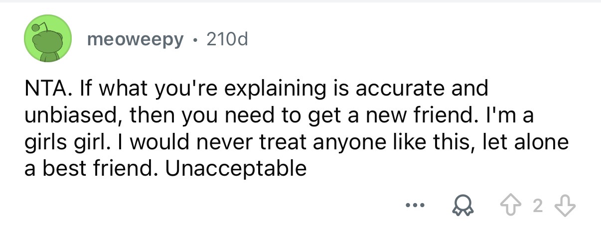 When her friend returned, she attempted to justify her actions, saying, “I’m not sure what I did to make you so upset, but I really don’t appreciate how you treated me when I was just trying to help.” The Redditor explained her perspective, emphasizing that she wouldn’t have treated her friend that way if roles were reversed.
