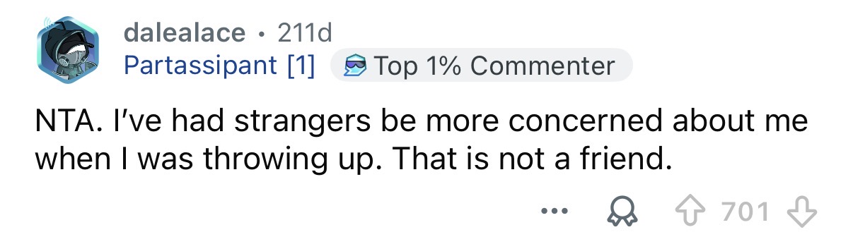 Eventually, the Redditor had to run back to the bathroom to throw up again. Her friend followed and asked, “so you wanna go?” She replied, exasperated, that she had asked multiple times and didn’t understand why her needs weren’t being respected.