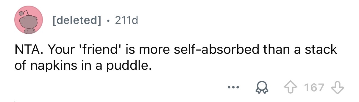 The friend doubled down, insisting, “You’re an adult! Book your own taxi. This shouldn’t be my problem, and I can’t stay here with you tonight; I’m going somewhere else.” In that moment, the Redditor admitted she could have booked her own taxi but was too sick and reliant on her friend to manage the situation.