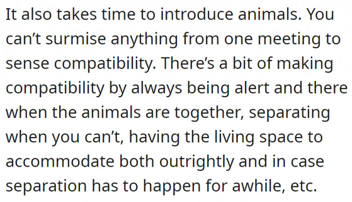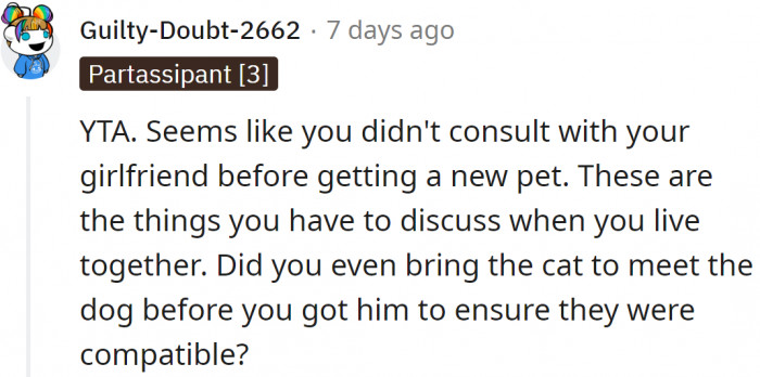 Additionally, setting boundaries regarding interactions between the new dog and the girlfriend's cat can help ease tensions. A study from Stanford University suggests that clear boundaries can enhance relational harmony in situations involving pets.