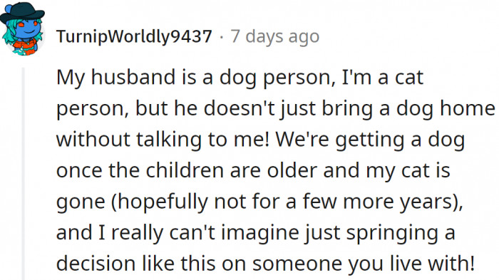 "I really can't imagine just springing a decision like this on someone you live with!"