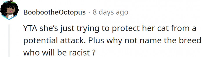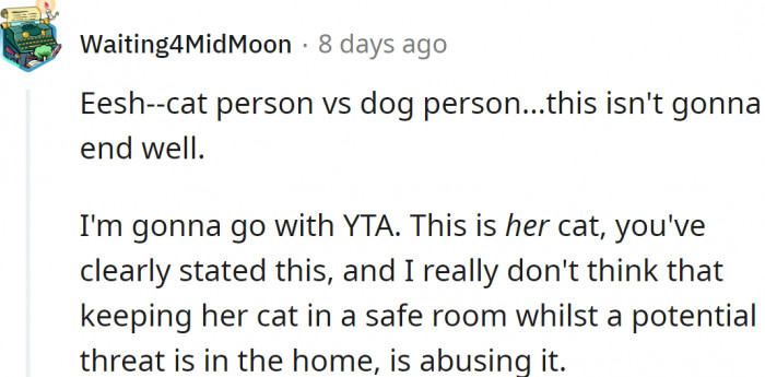 "I really don't think that keeping her cat in a safe room while a potential threat is in the home is abusing it."