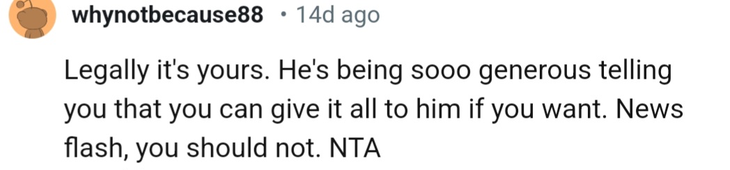 OP’s half-brother suddenly declared that their mom would’ve wanted him to have the whole thing. His logic? Well, it was simply a little reward for not being, well, estranged. He even ‘kindly’ offered OP the option to waive their half if they felt so inclined. How generous.