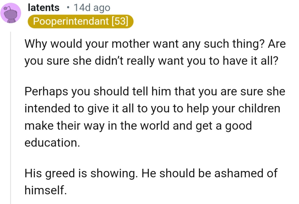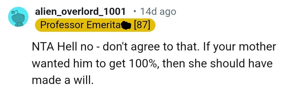 Redditors agreed that OP was NTA in this case. If their mom had wanted the brother to have it all, she would have penned a will.