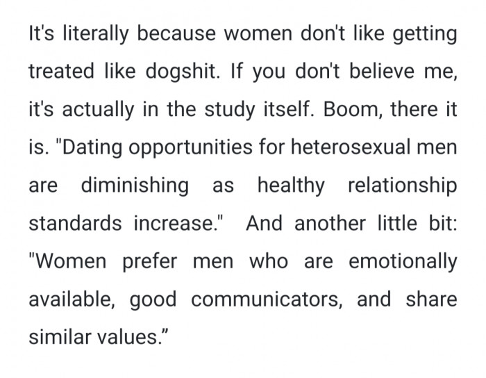 This right here may be the most ironic point. Straight women have finally reached the point where they no longer *need* to be in a relationship with just any man they can get.