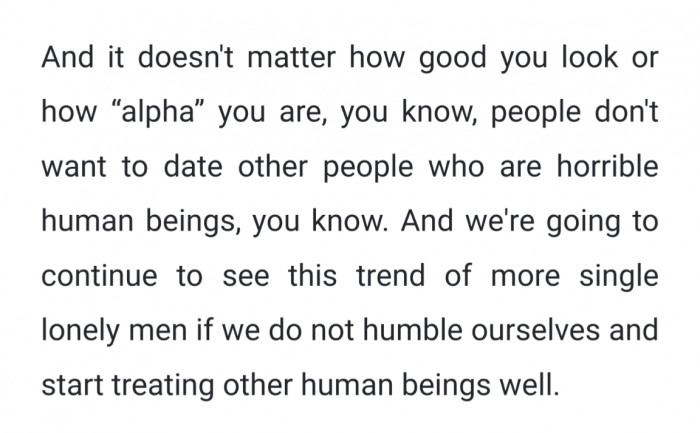 Essentially, men must be ready to put in some work on themselves if they don’t want to risk spending their lives alone. They should probably start ASAP.