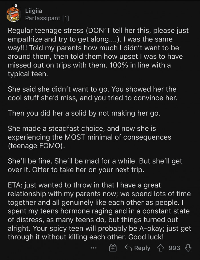 RedditThe teenage daughter Sarah refused to go to Disneyworld.