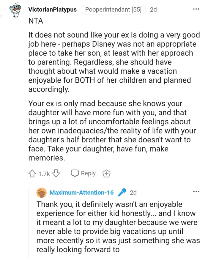 However, a recent turn of events stirred up a mix of emotions. Last weekend, OP's ex and her husband decided to take their children on a magical adventure to Disneyland.