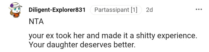 "Your ex took her and made it a terrible experience. Your daughter deserves better."