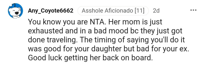 "You know you are NTA. Her mom is just exhausted and in a bad mood because they just got done traveling."