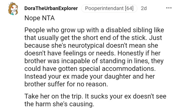 "Nope, NTA... People who grow up with a disabled sibling like that usually get the short end of the stick."