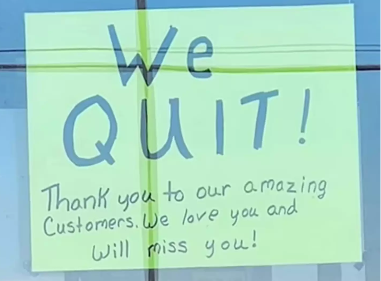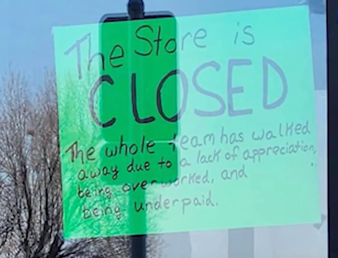 A separate sign found within the store detailed that the entire team had decided to leave due to feeling undervalued, overwhelmed by their workload, and inadequately compensated.